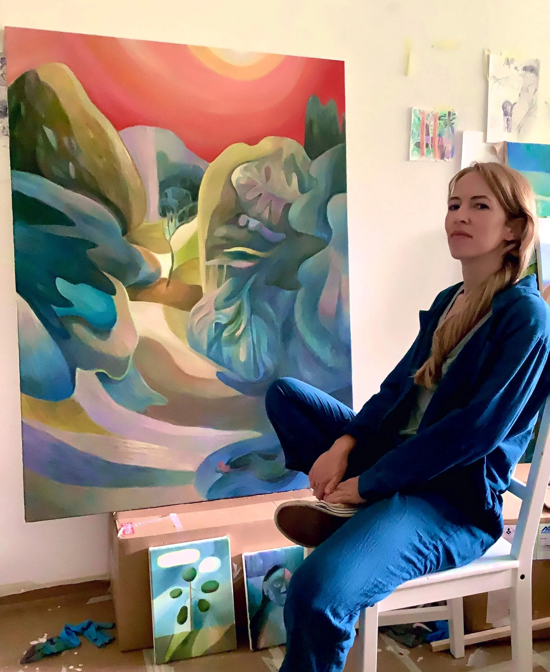 In my work, I don’t try to revisit those bucolic scenes from art history, but rather create imagined landscapes inhabited by people who could belong to any place or time. Through colour, composition, and body language, my aim is to convey scenes imbued with psychological tension that invite interpretation but resist a single narrative. The painterly application of paint, soft, rounded forms, and subtle diffusions of colour invite calm, while the expressions and poses of the figures suggest either tranquillity, thoughtfulness, and rest on the one hand or evasiveness, intrusion, anxiety, and weariness on the other. In keeping the context ambiguous, I hope to allow the viewer to explore what their interpretation reveals about their own relationship to our world.