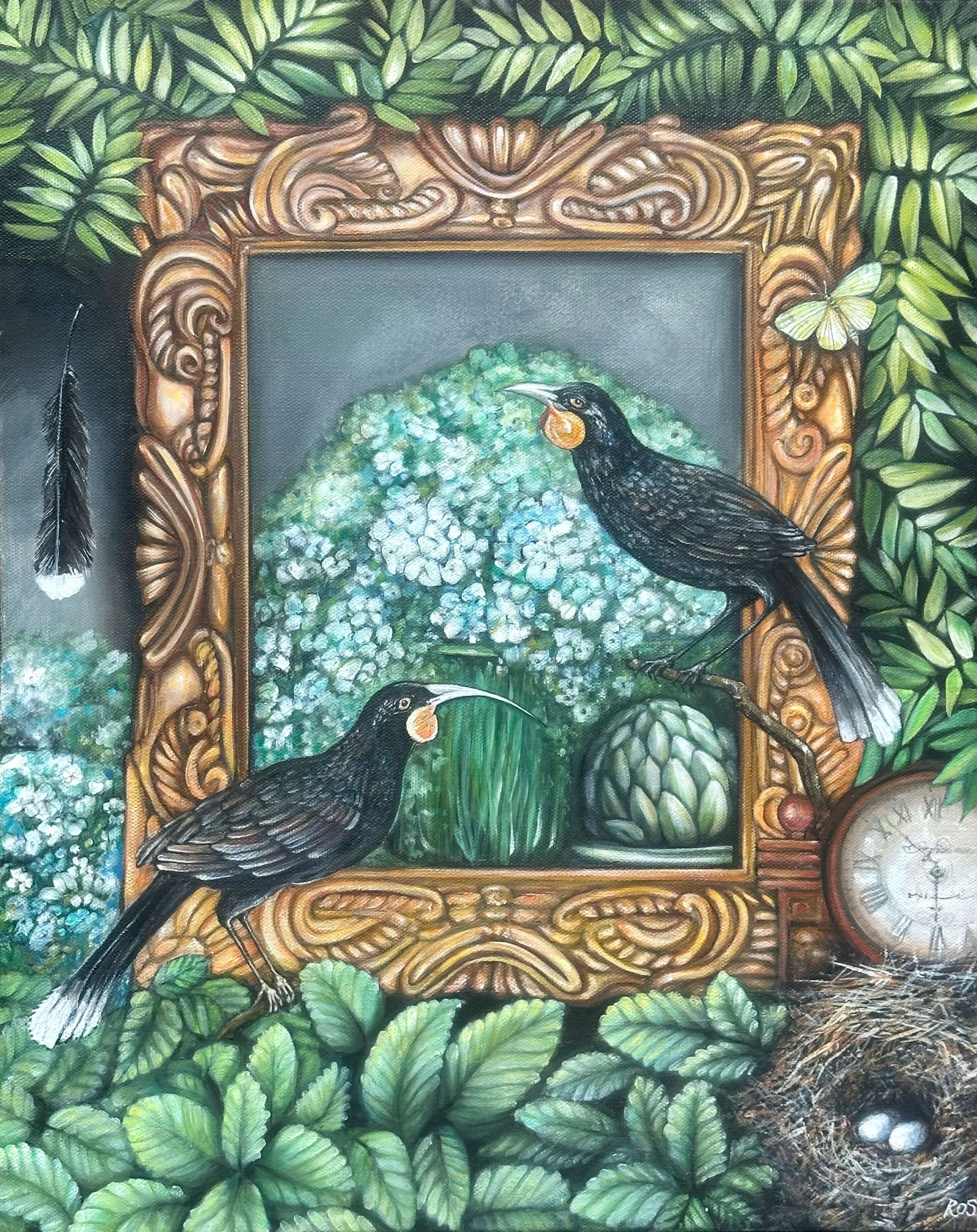 Rosamund Lowrey is a UK-born, New Zealand-based painter whose richly symbolic still life works explore the intersection of history, culture, and ecology. In her interview, she shares insights into her focus on native bird species—especially the extinct Huia—and her process of storytelling through composition and form.