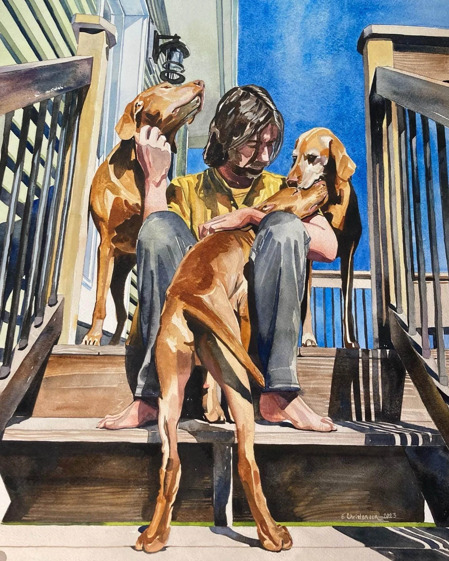 Eva Christensen’s watercolor paintings capture fleeting domestic moments and the deep connection between humans and their canine companions. Featured in AQ Volume VI, her Stay series uses narrative and light to explore love, loss, and the passage of time within Maritime settings.