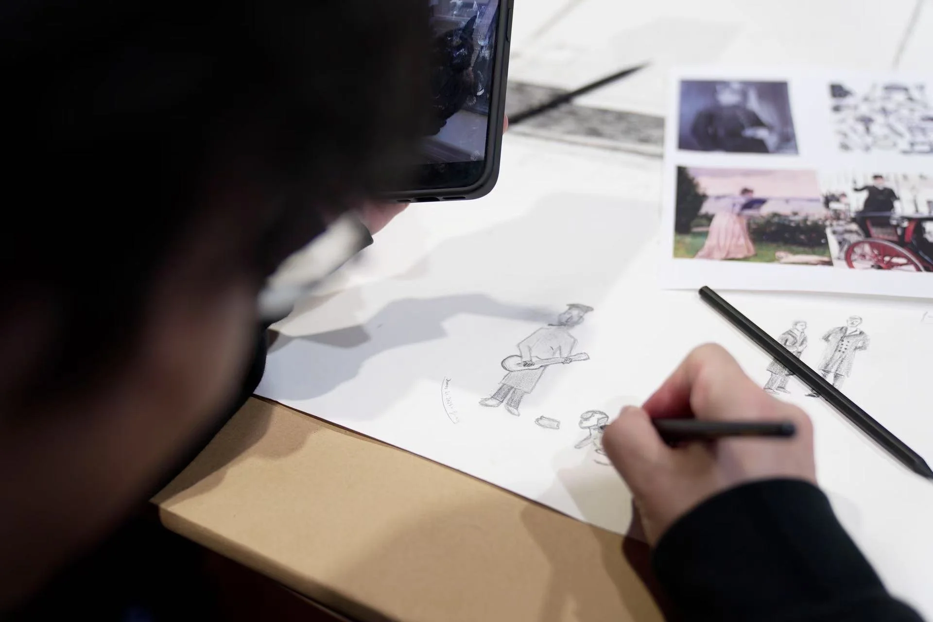 As the sketches unfold and join one another, they do not simply stitch images together. They allow eras to flow into one another through the logic of the scroll: a Victorian cargo vessel might sit beside a modern loading crane; the silhouette of a long-ago dockworker might neighbor the gesture of a contemporary artist wheeling supplies; a child walking the riverbank today might meet the gaze of a boy from a century past waiting on the tide. Time ceases to stack vertically. Instead, the scroll unrolls it laterally—rearranged, expanded, made porous. The riverfront becomes a form of “readable history,” and each participant’s mark folds them gently into this cross-century narrative. They are no longer observers; they become figures within the scene, part of the riverbank, a page of London itself.