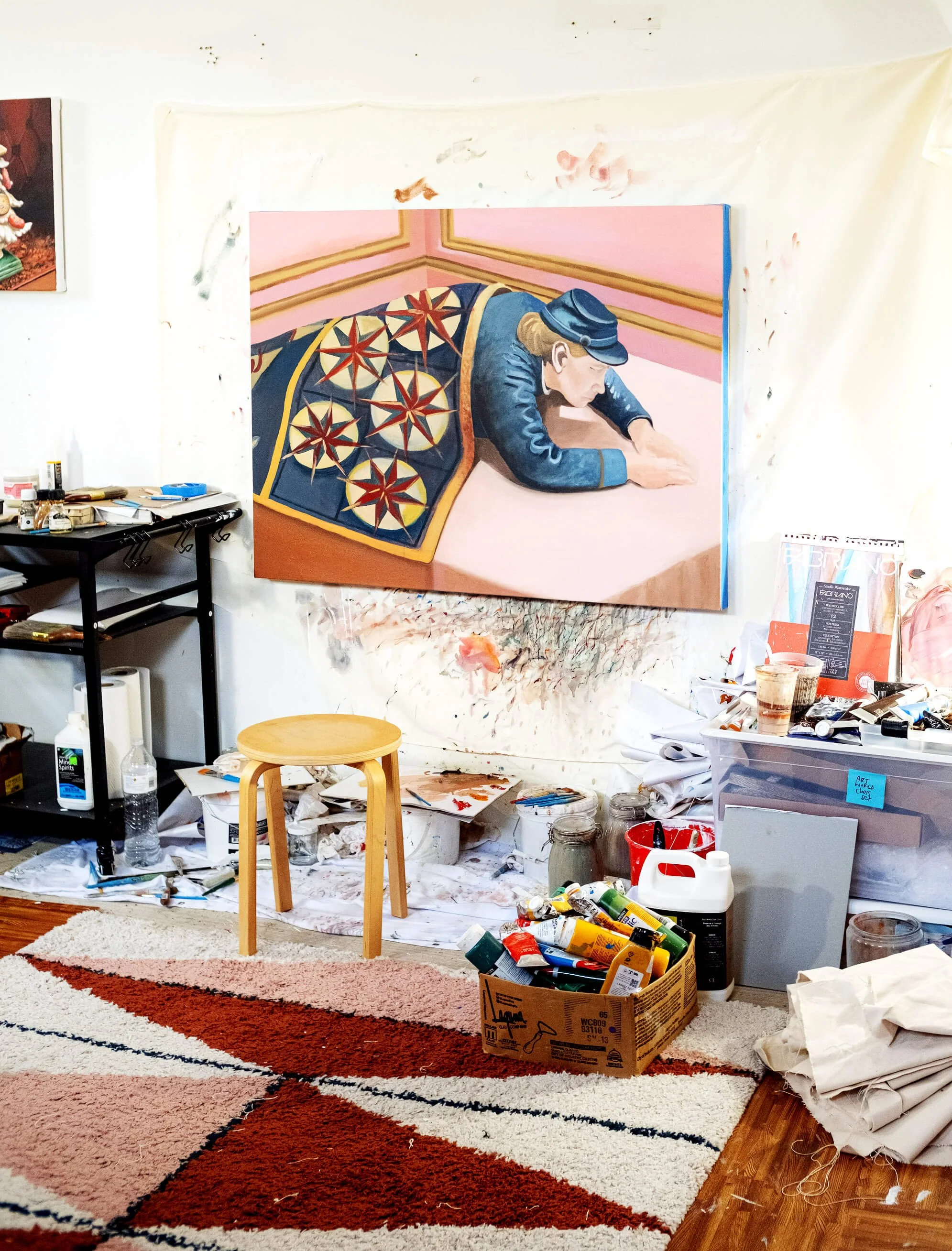 All the different parts of my practiceāfrom daily drawings that become cohesive graphic novels, to studies of imaginary quilts and textiles, to satirical paint-by-numbers responding to current politics, and snapshots of evolving charactersābegin in the privacy of the studio and often remain unseen for a time. I share only when a body of work has passed through an internal process of experimentation, reflection, and critique. The studio itself is a living, breathing space where play and discipline overlap, and where growth and transformation occur. It feels rare and special when a visitor truly experiences the full breadth of this layered practice.