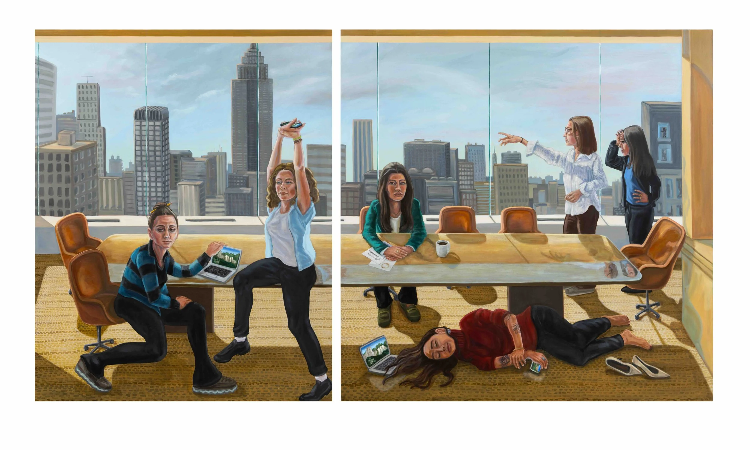 Here, within these indoor scenes, the figures are detached from nature, installed in sky-boxes of human engineering and surrounded by interior design of someone’s very particular choosing. The subjects are often doubled in adjacent reflections as doppelgängers or shadow-selves that hover near the original. Among the paintings on view is a suite of five works representing one couple in an expansive private space as they navigate moments of connection and emotional nuance. A large diptych, an homage to Balthus’s ‘The Mountain’, captures a sense of distance, ennui and longing for escape from the urban office setting. In all of the works, the interior environments in which Horing carefully sets the figures serve to extend the portrait by reflecting not only how these characters see themselves, but also how they might wish to be perceived within a broader societal context.