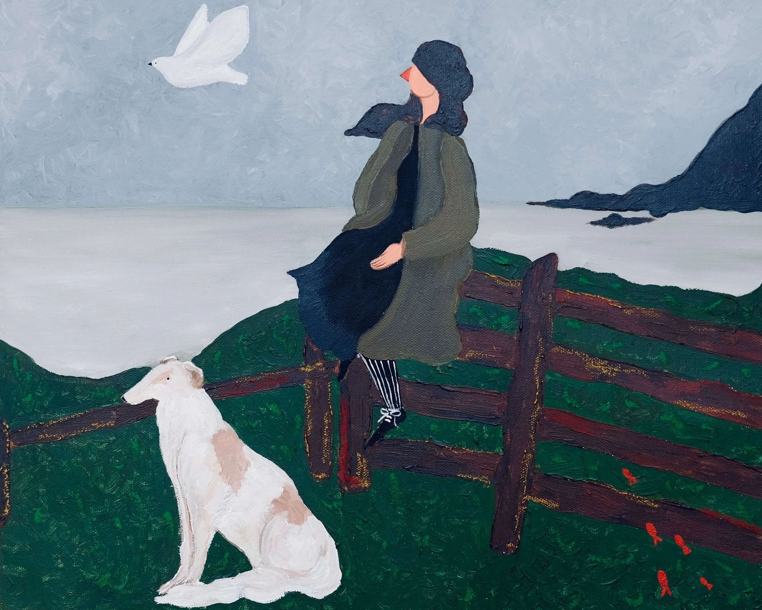 For me, words and images usually go hand in hand, almost like a well-choreographed dance. One leads, the other follows, and together they create something complete. Yes, there are times when a painting doesn’t need words at all—it’s simply meant to be enjoyed on its own. But the larger dialogue is always there: the birds, the fish, and of course, Mrs. H. She is my mouthpiece, and I love being able to let her speak through both paint and words, as if the two were never really meant to be separated.