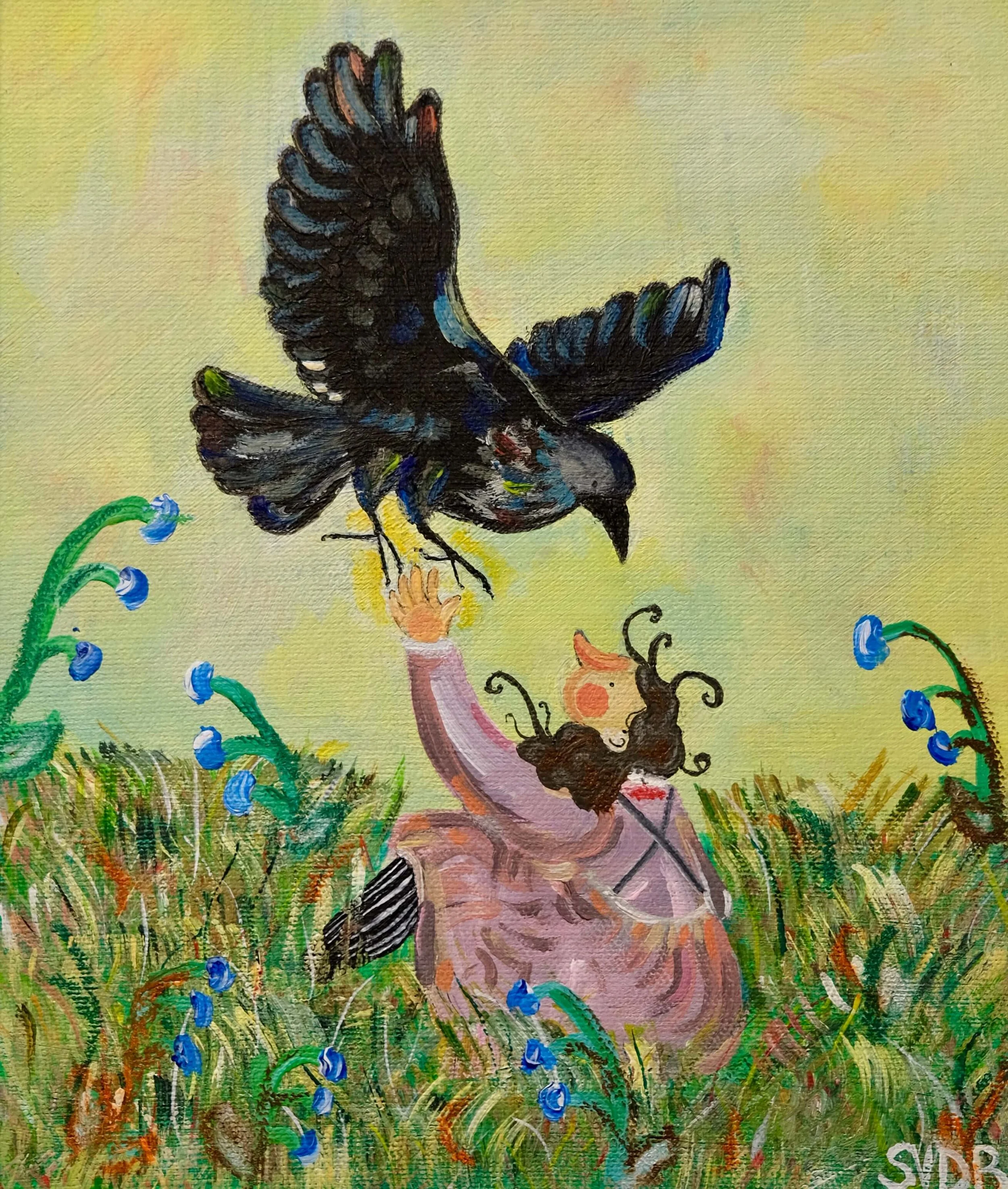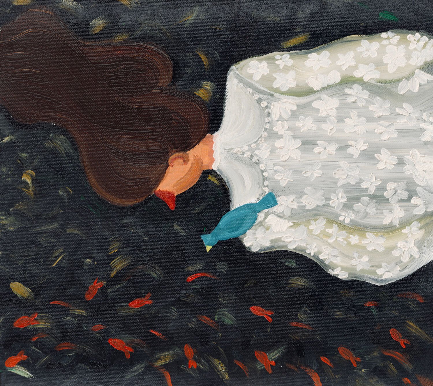 Birds often find their way into my paintings because, to me, they represent truth—and truth, for me, is Christ. Truth matters; it sets you free. Fish, on the other hand, symbolize society’s constant nudging and poking, that pressure to conform and swim with the stream. Mrs. H doesn’t give them much notice. You’ll find that she’s always looking to the left—unconventional, choosing the road less traveled. Whether I include birds, fish, both, or none at all also depends on the composition of each piece, as they’re never just decorative, but part of the story being told.