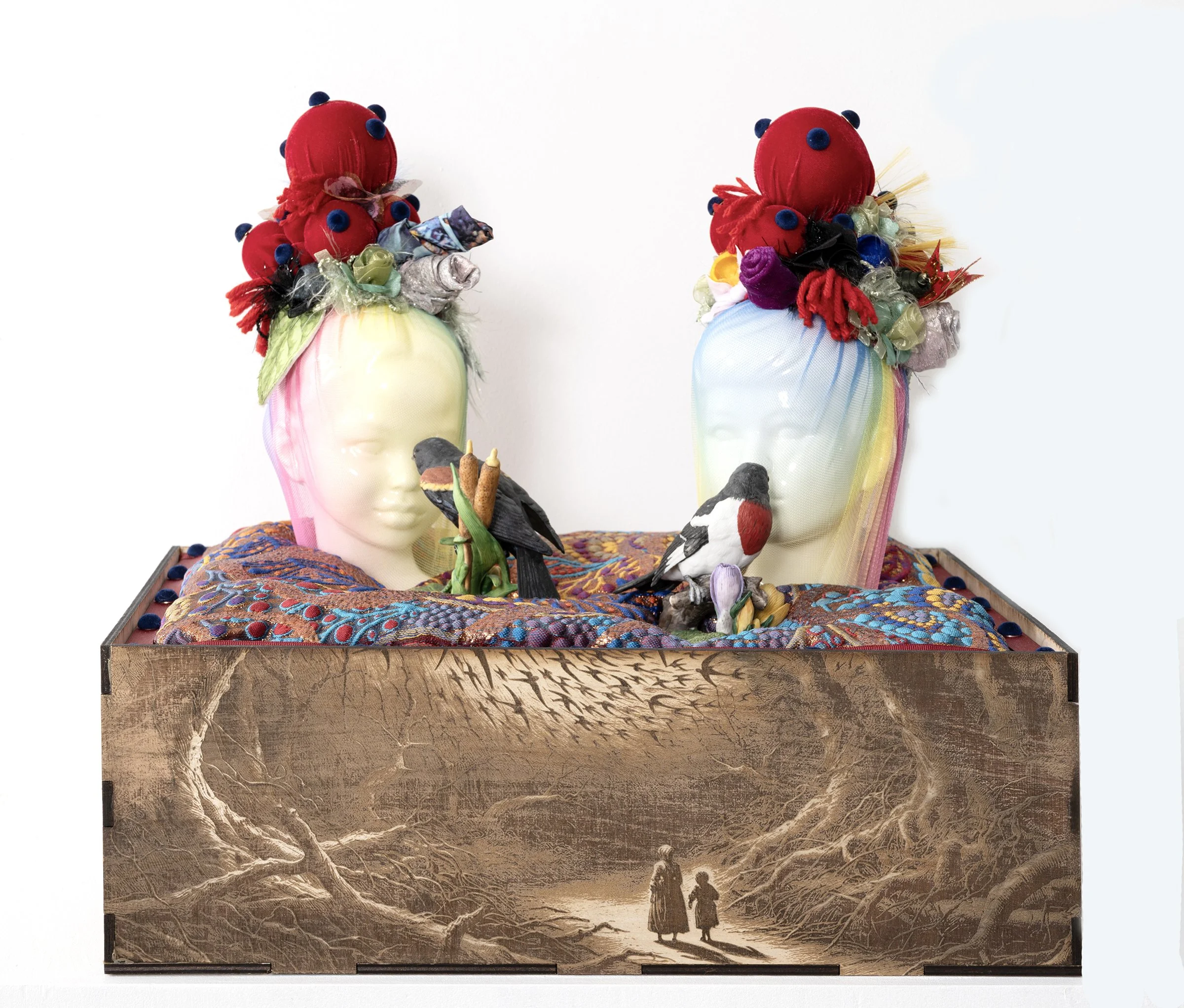 There is enough information about the negative impact of our use of animals for food and clothing on their health and welfare, on our health, and on climate-change, and we are in the position now to cease abusing and using them. I am just finishing a very large body of work titled Safe Zone. In it, I raise animals to equal human status and even exalt them as higher beings. To bring this to fruition, I thought deeply about how I could make a statement influenced by my veganism, without using gore or dark imagery that would drive people away. Instead, I show them with love and concern; I have created bright, colorful creatures and environments in which some of the animals are crowned, some have been outfitted with prosthetic legs, some are sparkled with Barbie pink. These works utilize vintage tapestries and needlepoints, vintage porcelain birds/human busts, 3D printed elements, laser engravings, and AI manipulated in very different ways than most are using AI at this time. By using repurposed elements, I proffer up my Utopian world of animals while also reusing elements created by humans. I'm not perfect, but I have structured my whole life, and the way I live, to reflect my passion for changing this system.