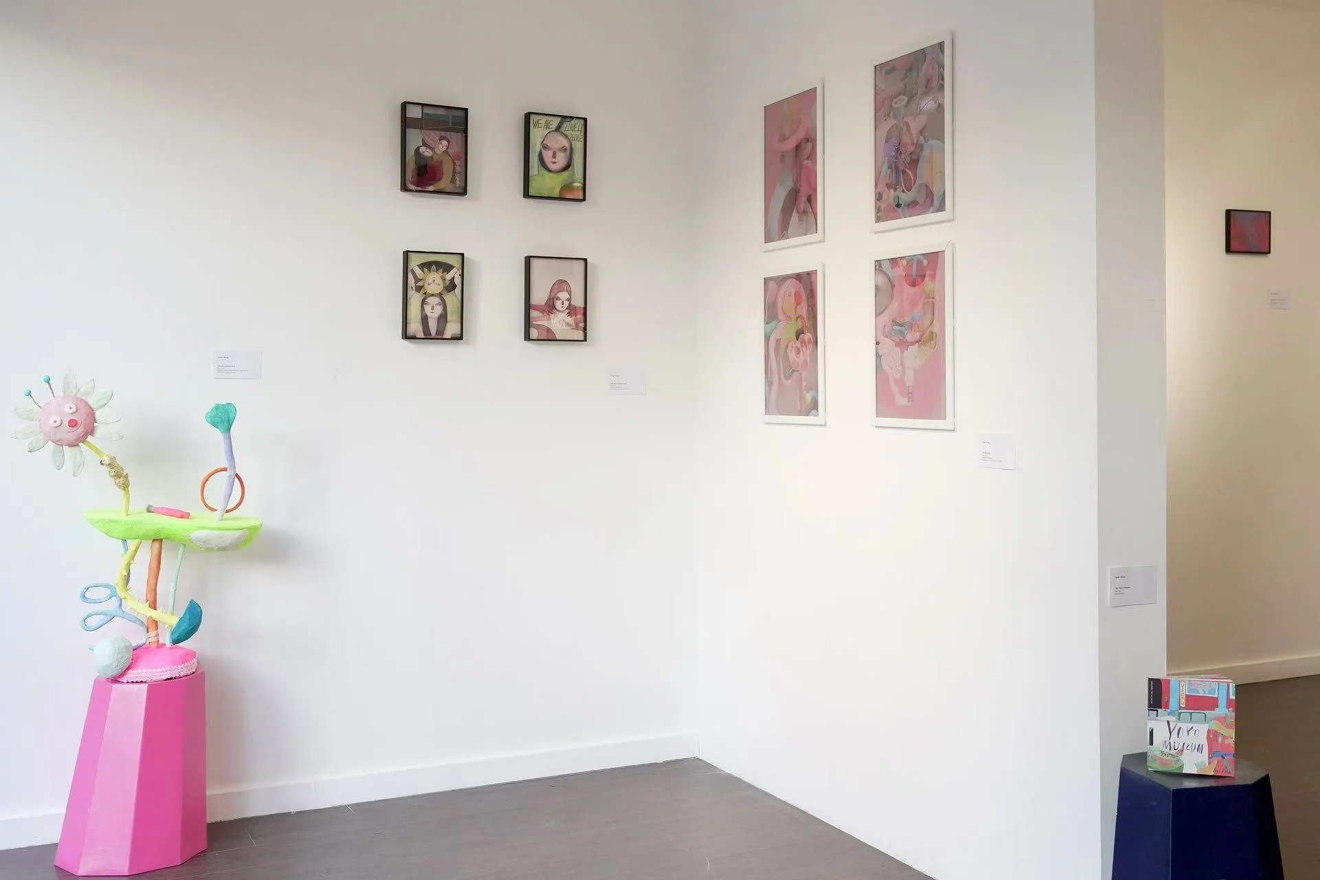 Building upon this material inquiry, Yuna Ding's practice extends into specific explorations of the body and relational thresholds. Her series We are lovely people offers a tender yet incisive look at intimacy as a space where identities blur and reconfigure. Drawing from her experience as a mother, overlapping figures and mediated boundaries examine connection as constantly tested and reformed. In a collaborative project for her son's fifth birthday, she transforms his whimsical drawings of airplanes into a shared artistic language, preserving a self-centered yet magical childhood perspective. Conversely, the digital project WARMENG constructs a virtual, internal world. Using 3D illustration and sound, it visualizes the interaction between emotions, hormones, and physiology, metaphorically mapping "happy hormones" to reveal the hidden energy operating within the body's structure. Together, these works traverse the interstitial spaces of relationship, memory, and internal sensation, grounding ethereal concepts in personal and bodily experience.