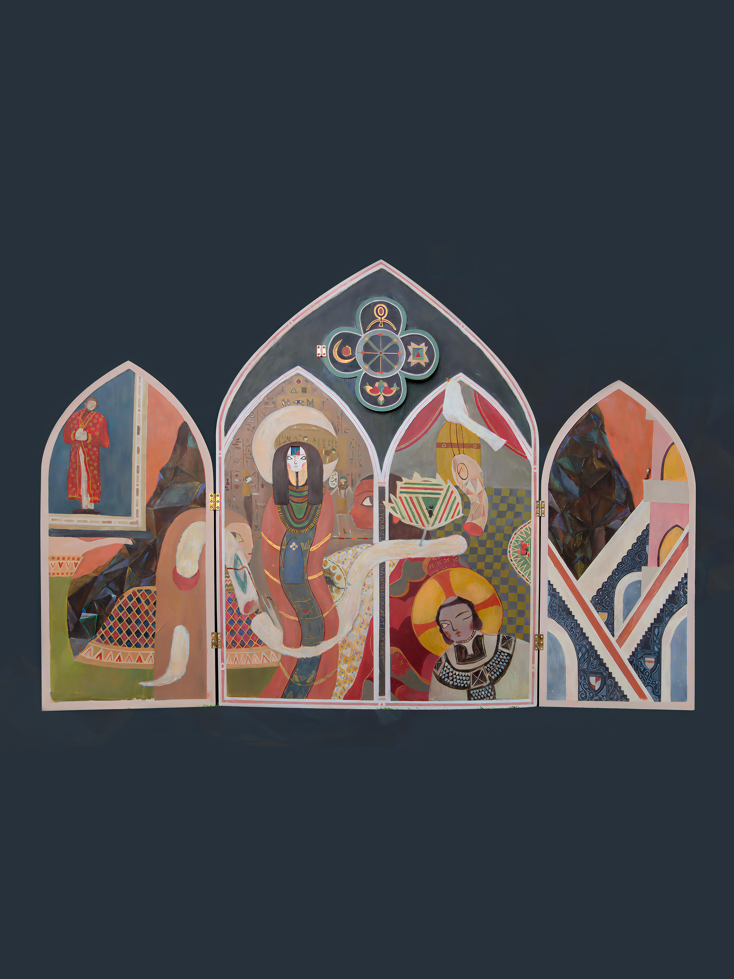 However, in the Clover project, he delves directly into this tension-filled core. The central work of the project is an oil painting built with wooden and window-like structures. Some view this painting as serving a somewhat complex and architecturally resonant function. Interestingly, it embodies a state of hybridity in its material form. Therefore, it can be seen as a layered narrative space rather than a simple flat collage. Symbols from Buddhism, Egypt, and Christianity coexist in a dynamic, and sometimes even tense, state of negotiation. It can be observed that this very structure may itself be expressing resistance to simplification. At the same time, it continuously emphasizes that true coexistence requires recognition of depth, friction, and history.